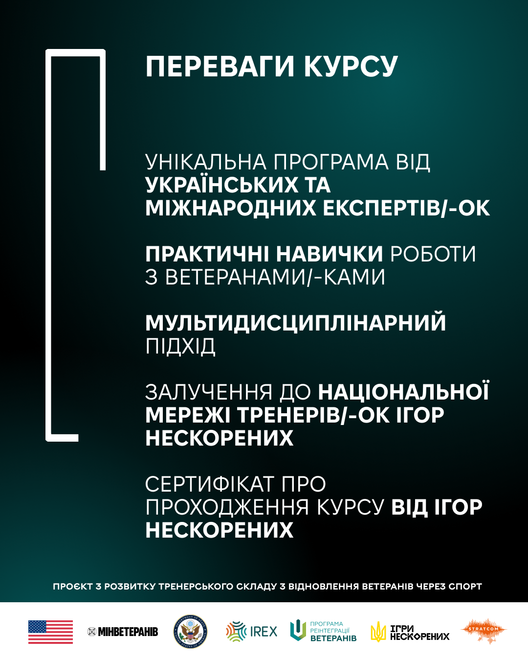 Проєкт створено на основі найкращих міжнародних та українських практик для підвищення кваліфікації тренерів/тренерок, які працюють з ветеранами/ветеранками у сфері адаптивного спорту. Учасники матимуть можливість здобути сучасні знання та практичні навички роботи з ветеранами, які отримали поранення, травми або захворювання внаслідок російсько-української війни.